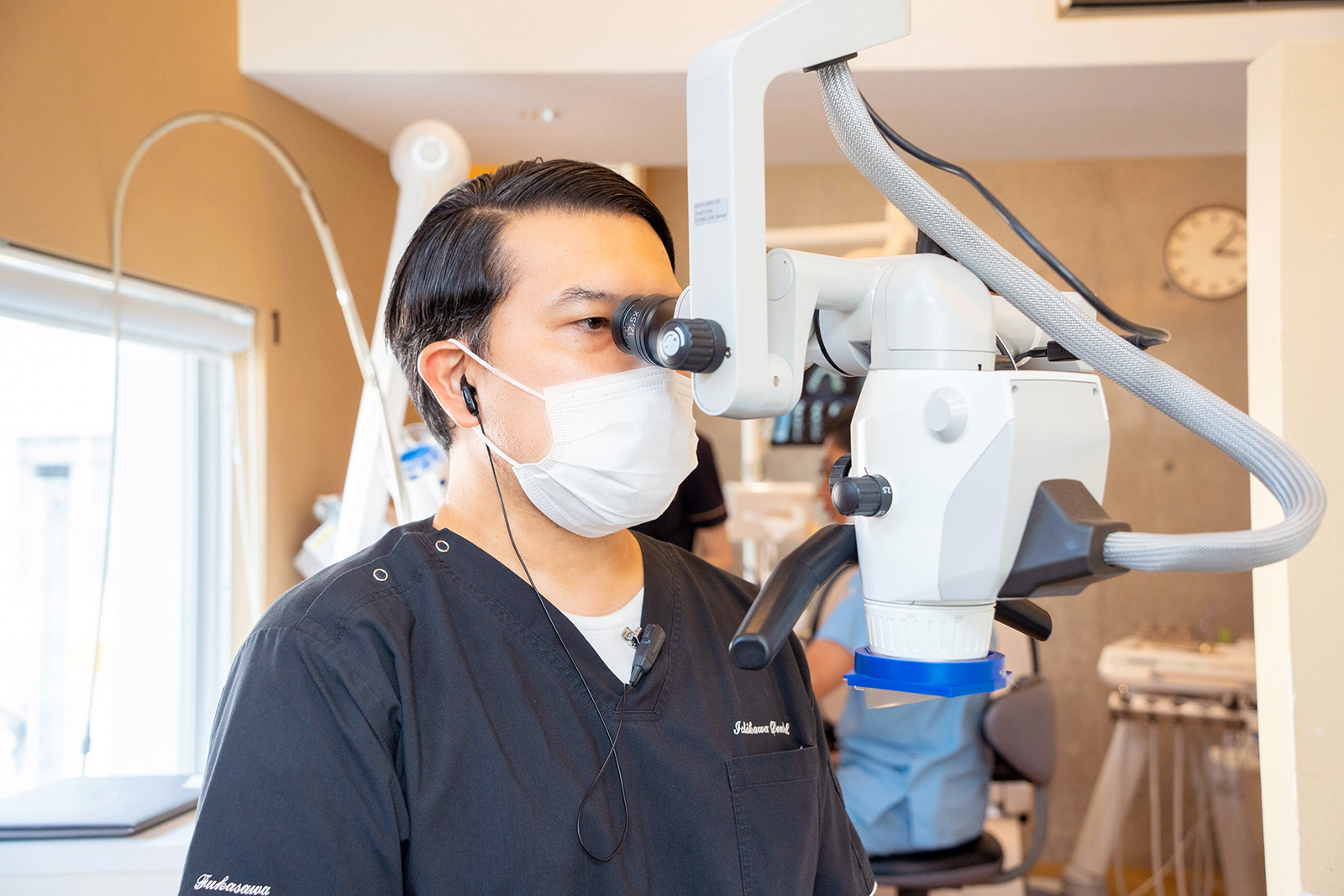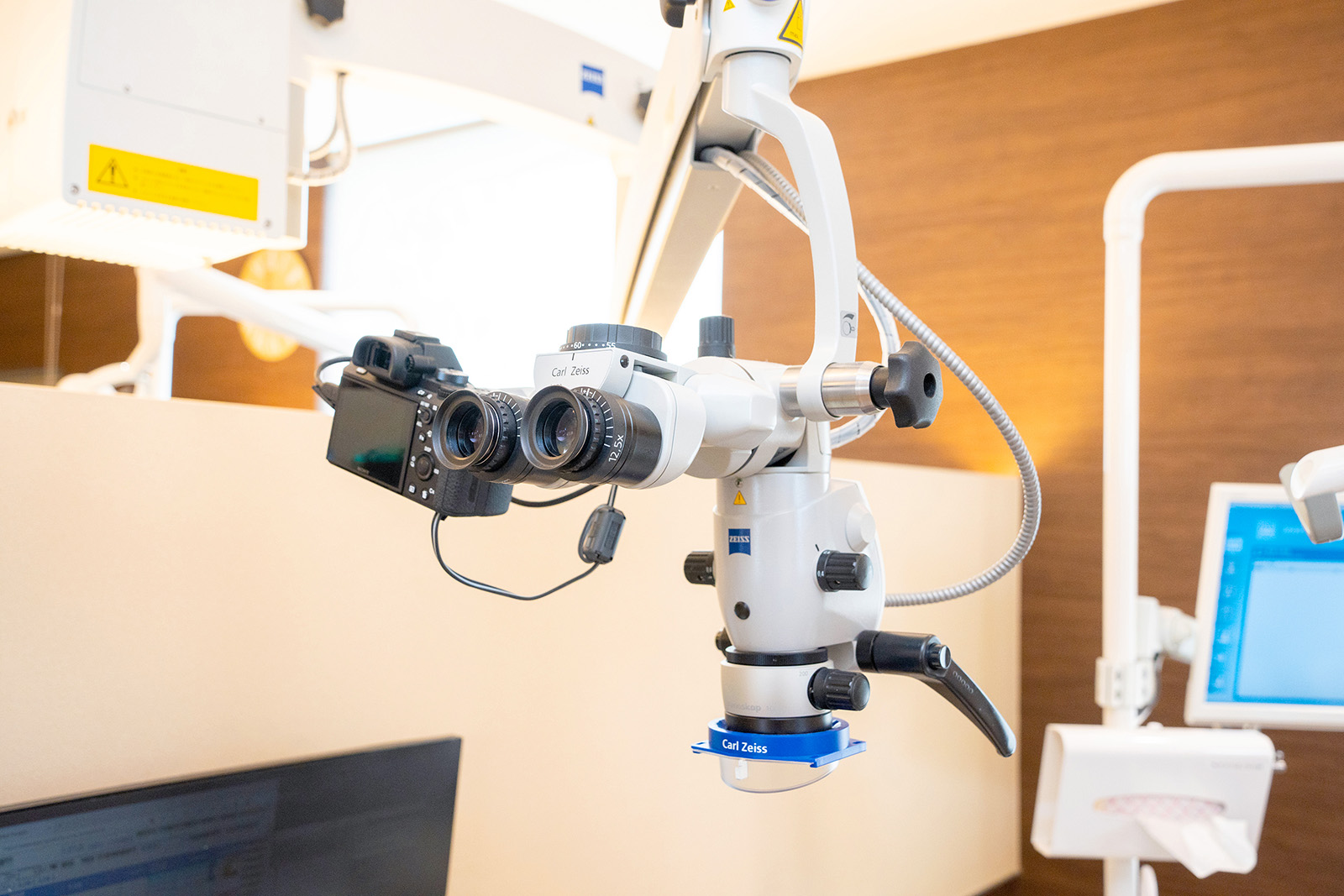マイクロスコープは、歯科用の顕微鏡のことです。これを使用すると、肉眼の十数倍の視野で「見える」ようになります。抜歯を回避したり、審美性の高い治療が実現できます。